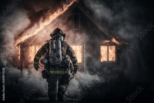 © stock_santa, Naklejka premium Fireman running to burning house. Firefighter high quality Generative AI photo