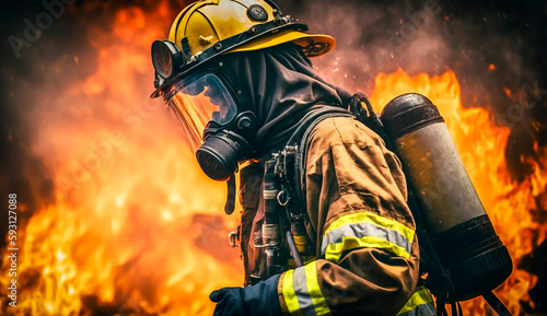 © Onchira, Fototapeta premium Fireman using water and extinguisher to fighting with fire flame wearing suit for safety, generative ai.