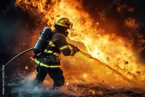 © Bargais, Obraz premium Fireman using water to fighting with fire flame. Generative AI.