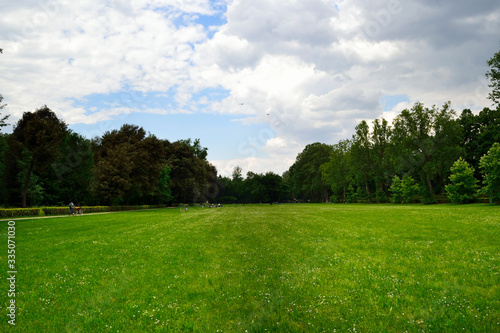 Naklejka premium Firenze, Le Cascine park. A wide green meadow surrounded by trees