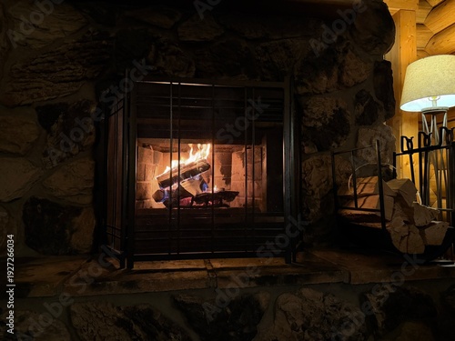 © New Africa, Naklejka premium Fireplace, firewood and lamp indoors. Cozy atmosphere