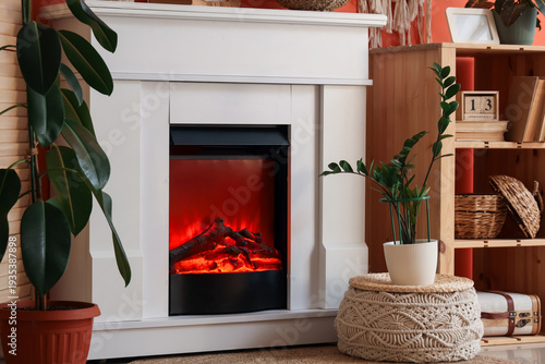 Fototapeta premium Fireplace with folding screen, shelving unit and decor near orange wall in...