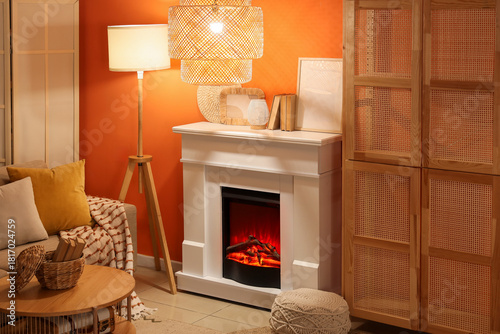 Fototapeta premium Fireplace with sofa, closet and glowing lamps near orange wall in living room