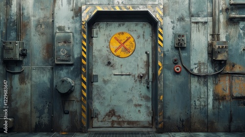 Naklejka premium Fireproof industrial bunker door with emergency firefighting symbols,...