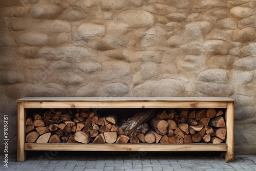 © nsit0108, Fototapeta premium Firewood pieces neatly stacked inside a wooden log rack, set against an old stone wall texture