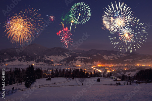 Obraz premium fireworks at mountain landscape. view of holiday city