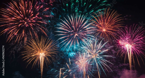 Naklejka premium Fireworks bursting with neon lights abstract background