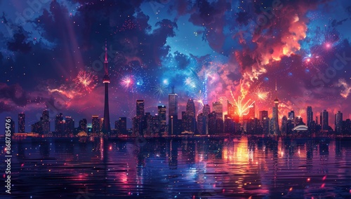 © @_ greta, Fototapeta premium Fireworks Display Over a City Skyline