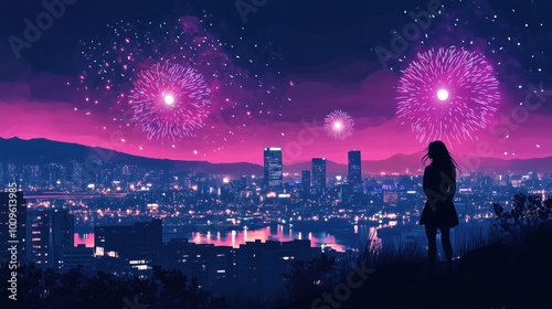 © Vergiliy, Fototapeta premium Fireworks display over city skyline at night