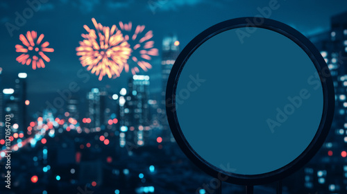 Fototapeta premium Fireworks display over city skyline nighttime celebration urban landscape...