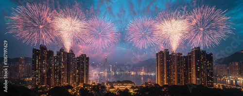 © Nadiyah, Fototapeta premium Fireworks display over cityscape at night. (2)