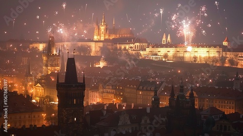 Fototapeta premium Fireworks Display Over Prague's Historic Cityscape at Night