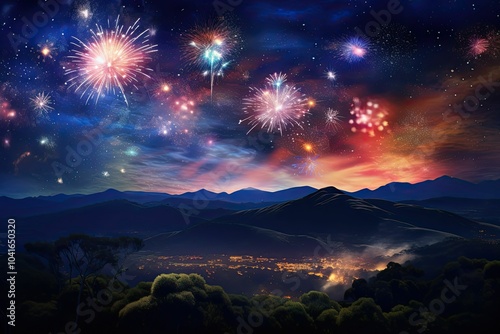 © damar, Naklejka premium Fireworks explode over mountains and a town.