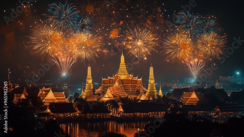 © Chatchanan, Naklejka premium Fireworks exploding over a grand palace during a New Year's Eve celebration