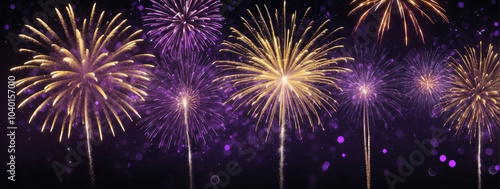 Fototapeta premium Fireworks illuminate the night sky in gold and violet for New Year’s celebration