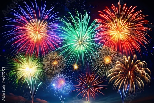 © Design_Poster, Naklejka premium fireworks in the night sky Set of firecracker icons for Anniversary, New year, Celebrate, Festival. Flat design on black background.