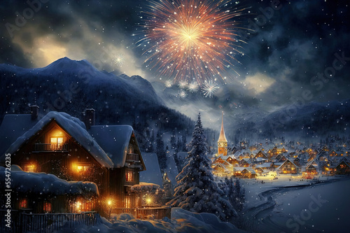 Fototapeta premium Fireworks in the sky above Christmas village. Winter Landscape. Generative AI