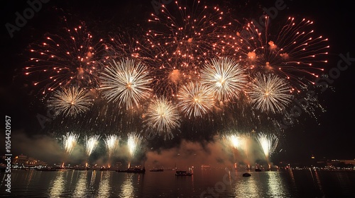 Fototapeta premium Fireworks light up the night sky over the Chao Phraya River in Bangkok, Thailand, as people celebrate New Year's Day.