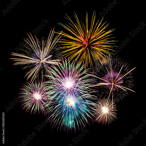 © boonsom, Naklejka premium Fireworks of various colors and shapes burst in night sky