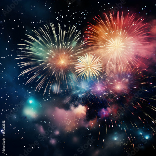 Naklejka premium Fireworks on black background, Fireworks light up the sky, festive fireworks...
