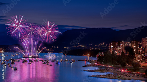 © Massimiliano, Obraz premium Fireworks on water during Vancouver's Celebration of lights