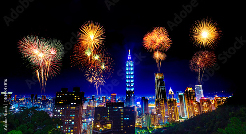 Fototapeta premium Fireworks over Taipei cityscape at night, Taiwan
