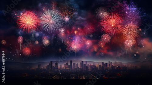 © Reiskuchen, Fototapeta premium fireworks over the city, New Year, Generative AI