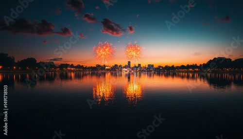 © Scroopt, Fototapeta premium Fireworks reflection on water, city skyline at sunset