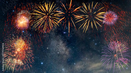 Fototapeta premium Fireworks with blur milky way background