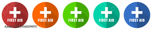 © Alex White, Fototapeta premium First aid icon set, red, blue, green and orange flat design web buttons isolated on white background, vector illustration