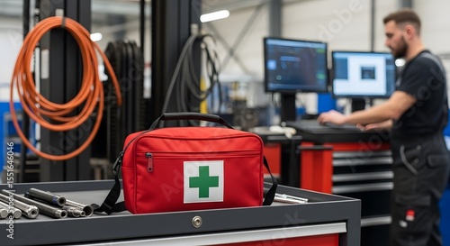 © Shabbir, Fototapeta premium First Aid Kit on a Toolbox with Medical Equipment in a Workshop with a Technician Working