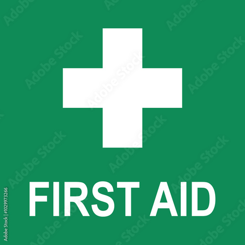 © pas_td 4425, Obraz premium First Aid Sign, Vector Illustration. Green square and white cross symbol with FIRST AID text below