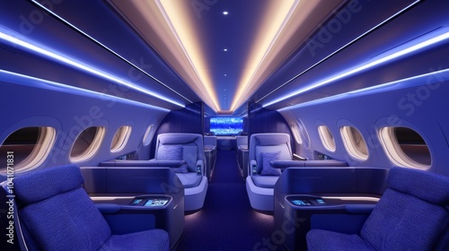 Fototapeta premium first-class journey, trendy individual, amber-hued lighting, in-flight entertainment, textured sweater, panoramic view, luxurious leather upholstery, peaceful ambiance