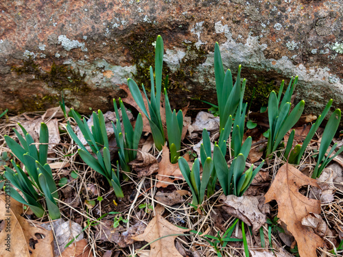 Fototapeta premium first daffodil leaves growing in early spring