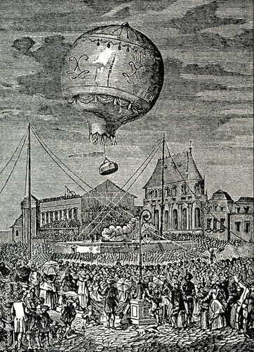 Fototapeta premium First flight of living beings in a basket attached to the balloon...