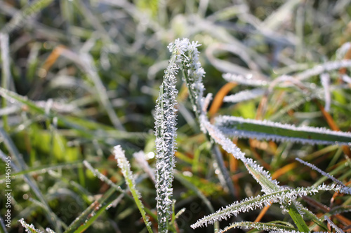 Naklejka premium First frost in autumn park. Early morning in november.