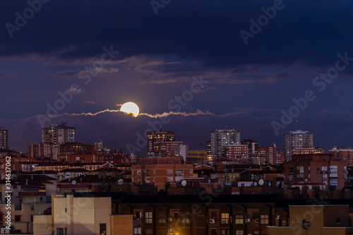 Naklejka premium First full moon of the year 2020 over the Madrid skyline