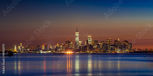 Naklejka premium First light of the day on Lower Manhattan skyscrapers from New York City Harbor. Financial District and Midtown West