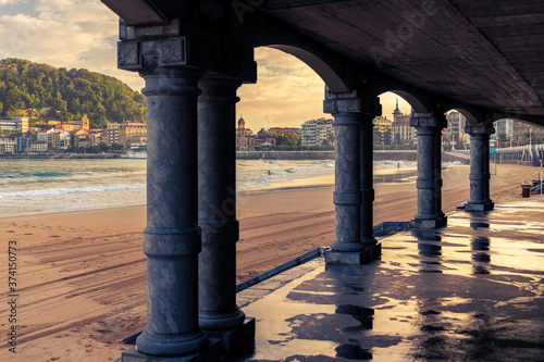 Fototapeta premium first lights of the day on the beach of la cocha in san sebastian, spain