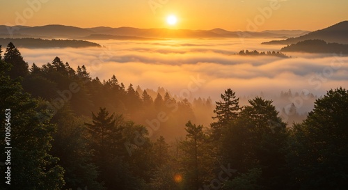 © Marco Mamdouh, Fototapeta premium First rays on foggy peak trees
