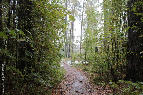 © Natalya, Obraz premium First snow fall in autumn forest with colorful foliage and wet path