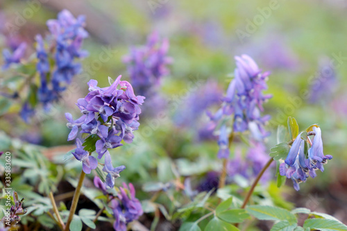 © Oleg, Obraz premium First spring flowers in a forest. Fumewort, corydalis solida blooming in a green grass