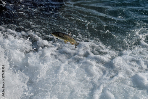 Obraz premium Fisch versucht den Rheinfall hochzuspringen 20.5.2020