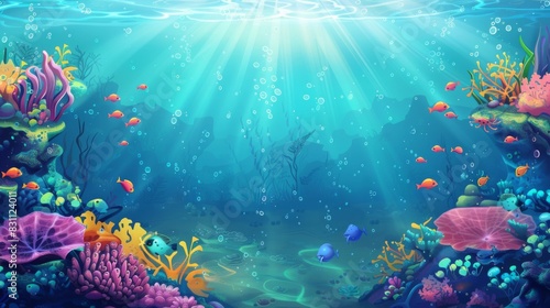 Naklejka premium Fish and coral reefs under the sea. Underwater world with seaweeds and sea...