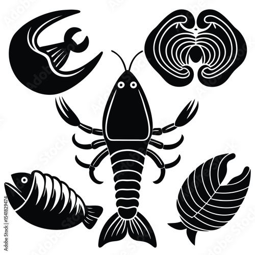 Obraz premium Fish and Seafood Vector Illustration Set, Monochrome Ocean Creature Designs, Fish Silhouette Collection