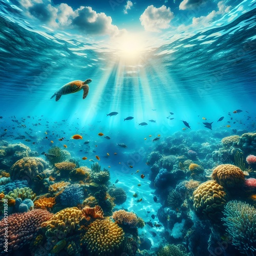© Rujeerat, Fototapeta premium Fish and turtles swim underwater amidst coral and soft blue light.