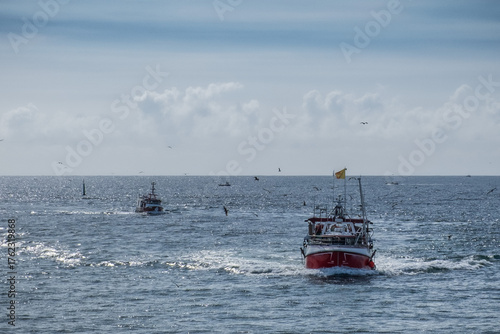 Naklejka premium Fish boat sailing back to the harbor in Atlantic ocean, Bretagne France