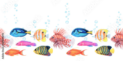 © Belenova_art, Fototapeta premium Fish bubble seamless border. Watercolor illustration of underwater ocean life on white background. Colorful lionfish, butterfly fish and golden antias in fishtank or aquarium