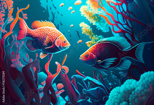© ApolloStella, Fototapeta premium fish in the ocean with coral, acrylic ink art - Generative AI