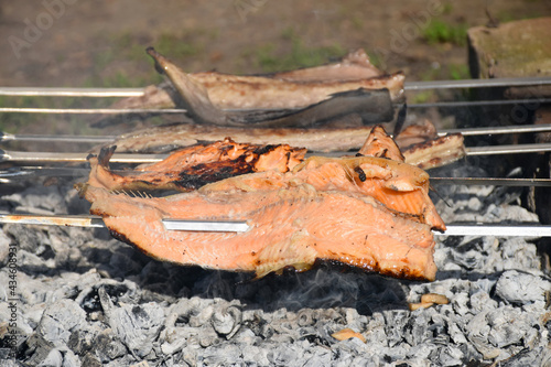 Fototapeta premium Fish kebab. Mackerel and trout on the fire